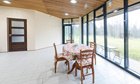 Дом максимально интегрирован в окружающую среду, визуально спрятан в глубине холма. Большая часть стены по периметру – панорамное окно со стеклами, удерживающими тепло. Смотровое окно есть и в потолке, таким образом, сидя у камина, можно любоваться и пробегающими облаками, и вековым лесом.