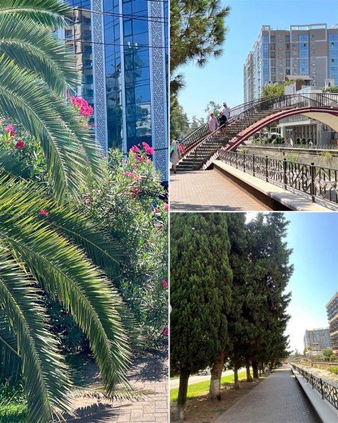 · Благоустроенная территория: Ландшафтный дизайн с декоративными растениями и пальмами, художественная подсветка в вечернее время.