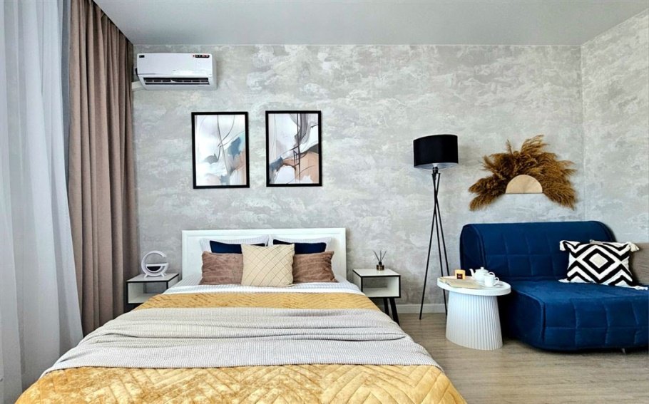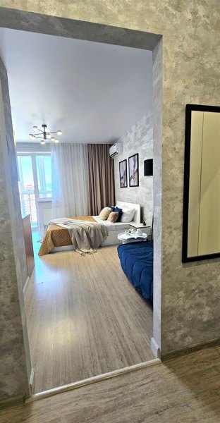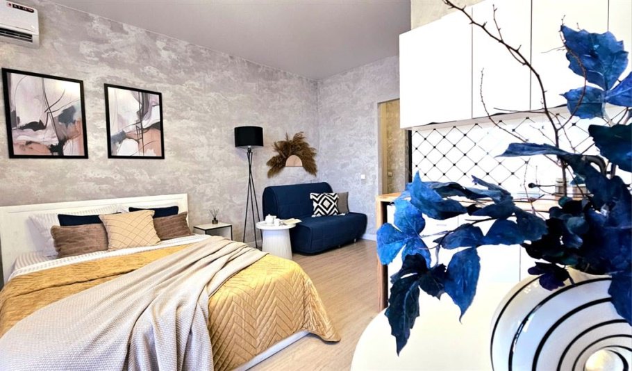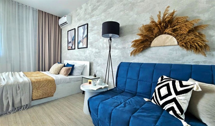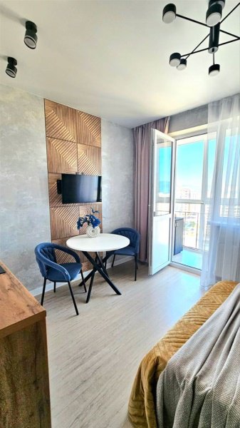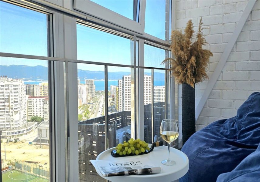 В квартире уже есть всё необходимое для проживания. Телевизор, стиральная машина, электрическая плита, микроволновая печь , кондиционер, кровать, диван, 2 прикроватные тумбы, журнальный столик, торшер, кухонный стол, 2 стула, шкаф для одежды , шкаф для постельного белья, утюг, гладильная доска, 2 кресла мешка и столик на балконе, посуда, бельё, полотенца.. Вайфай , телевидение. Совместный санузел. На балконе панорамное остекление с прекрасным видом на горы и море. Вся инфраструктура рядом. До центра 15 минут на транспорте. До моря 30 минут пешком.