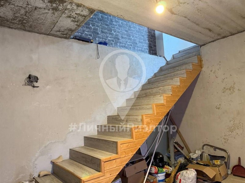 Лестница облицована ламинатом. Второй этаж отделан, обои, плитка на полу.