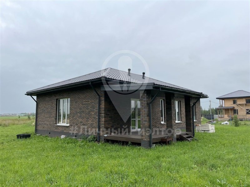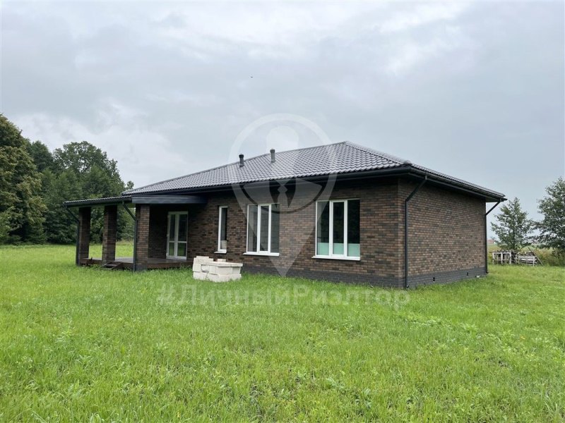 В доме просторная кухня-гостиная, 3 спальни, 2 санузла, гардеробная комната и техническое помещение. Стены – газосиликатные блоки, облицованные кирпичом. Окна с увеличенными оконными проемами, потолки высотой 3 м. Из гостиной выход на террасу.