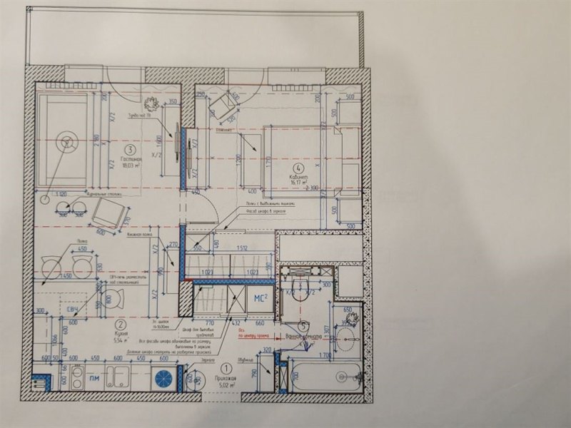 м (без учета площади лоджии). В квартире просторная кухня-гостиная 23,57 кв.м и уютная спальня 16,17 кв.м с гардеробной зоной 2,5 кв.м. Огромная застеклённая лоджия на обе комнаты. Окна смотрят во двор, на противоположную от проспекта сторону. Высота потолков в чистом виде 2,8 м.